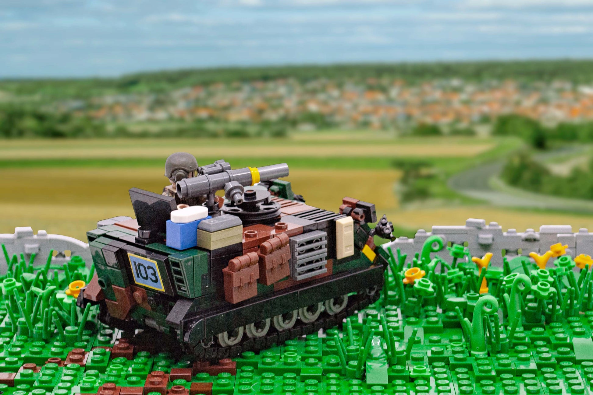 This 1:45 scale building kit depicts the iconic M113 armored personnel carrier, used in numerous conflicts since it was introduced in 1961. This version is an M113A2 equipped with the BGM-71 TOW anti-tank missile system. It is represented in a NATO 3-tone forest camouflage scheme, accurate for American mechanized units in the later Cold War.