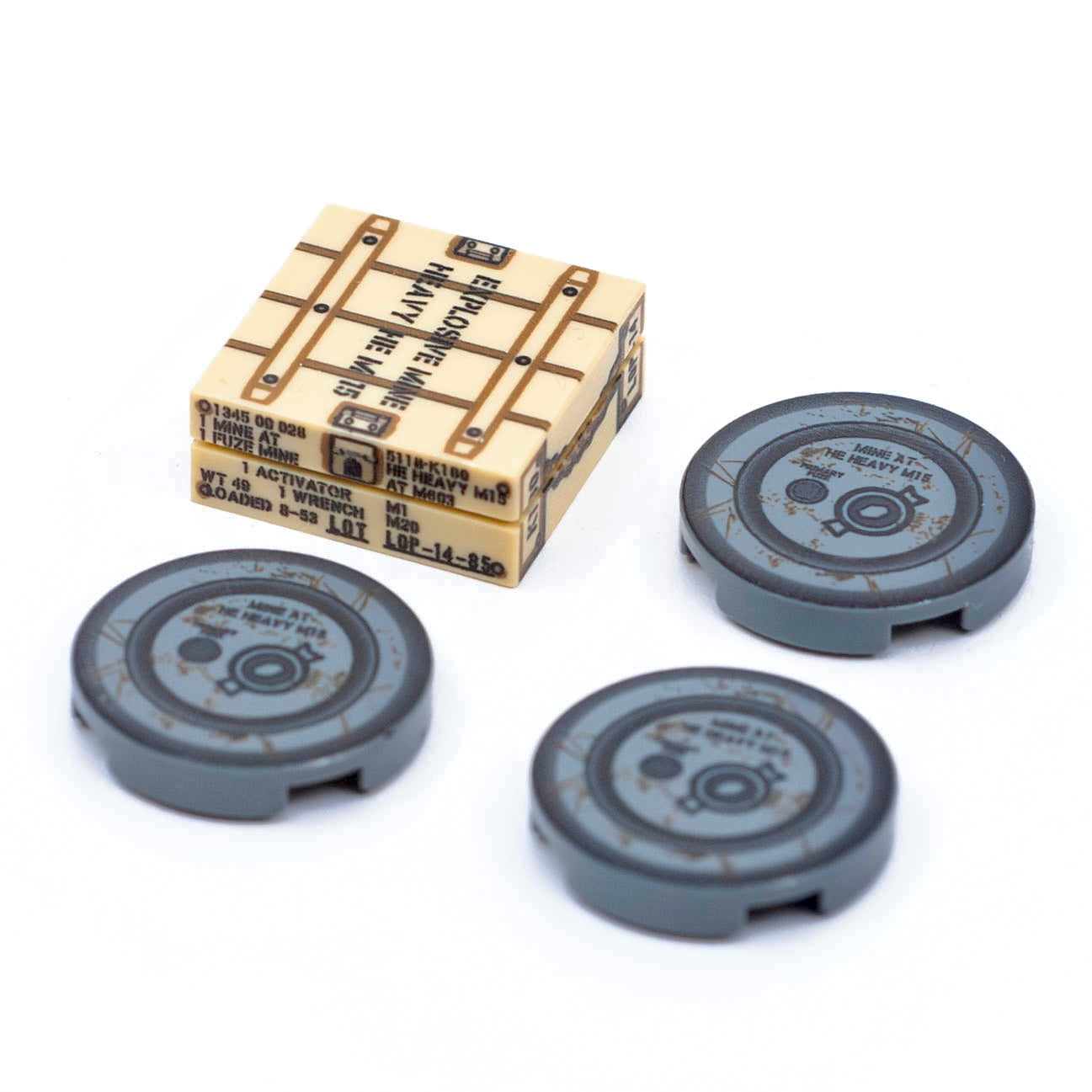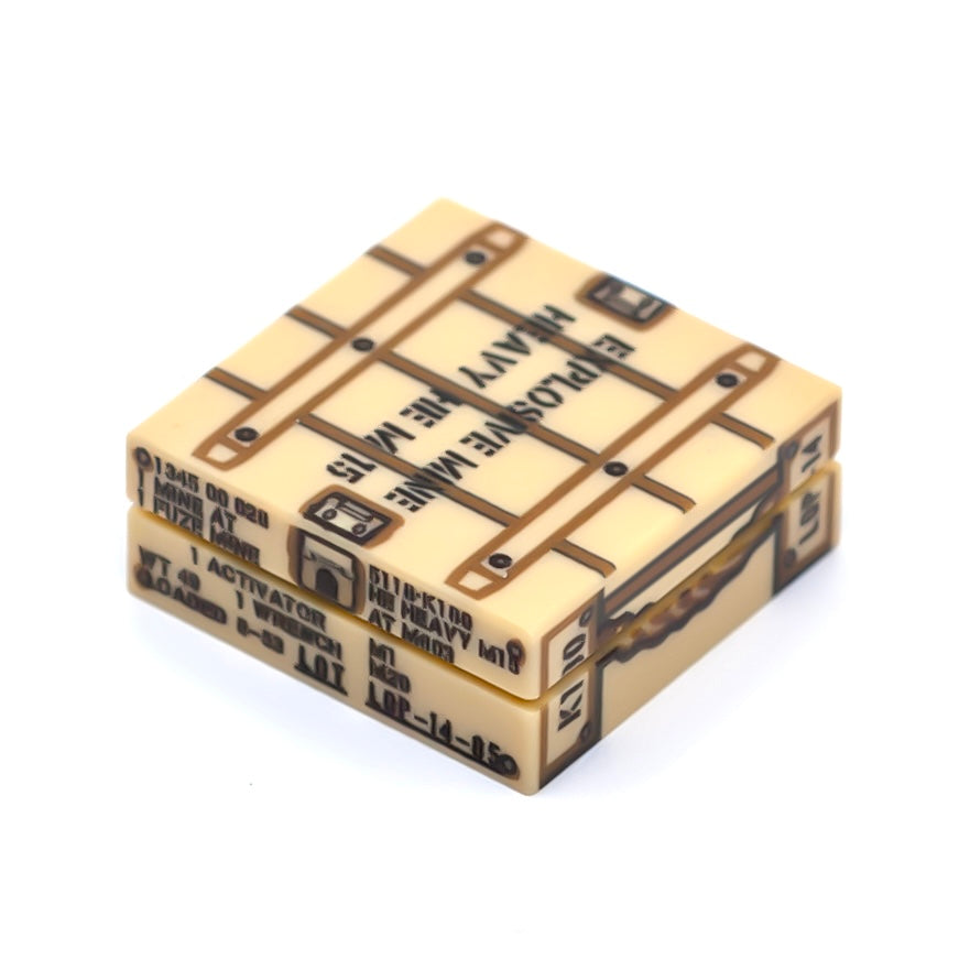 This toy accessory pack includes a UV-printed crate and three M15 anti-tank mine tile pieces. A Soviet armored battalion isn't deterred by a strongly worded no-trespassing sign!