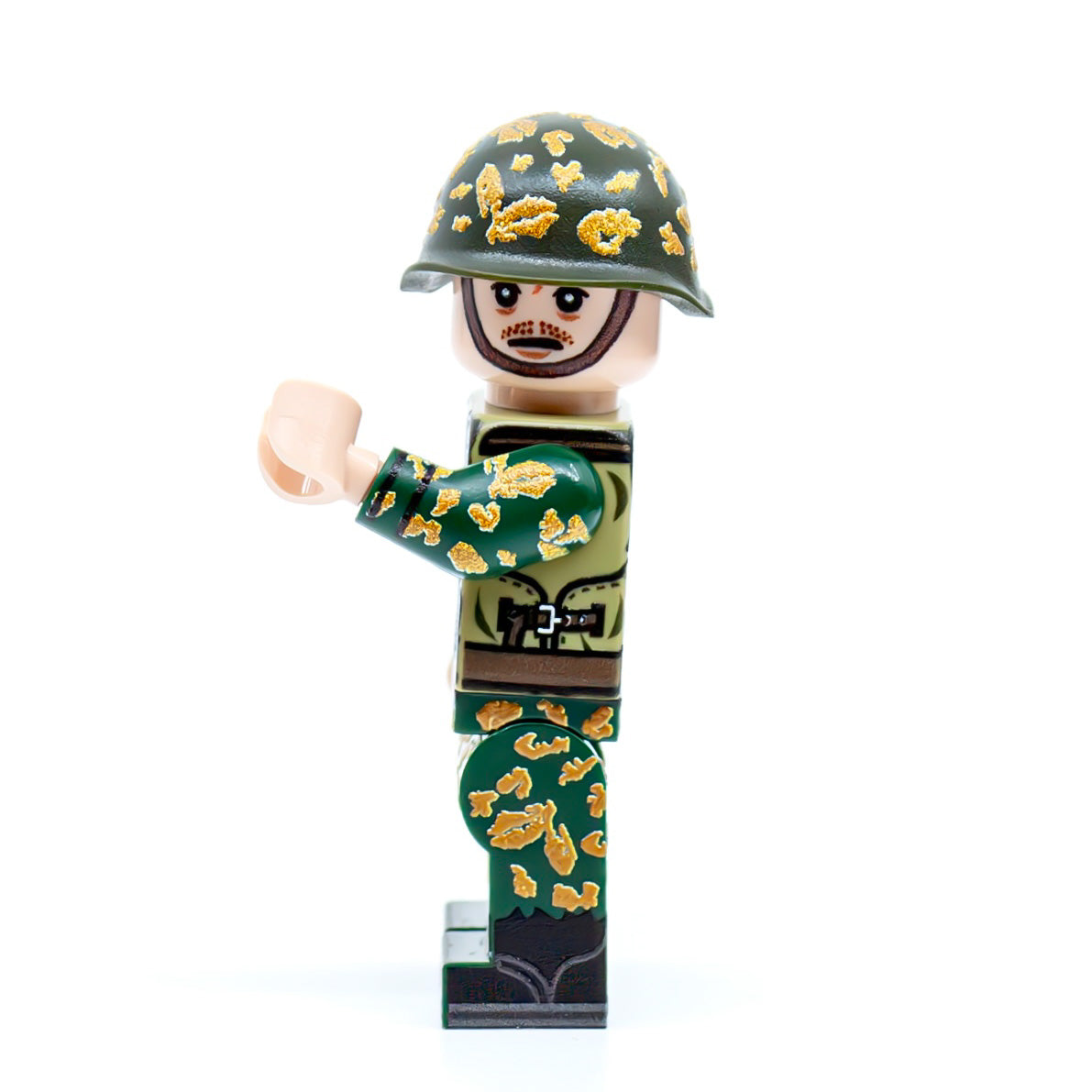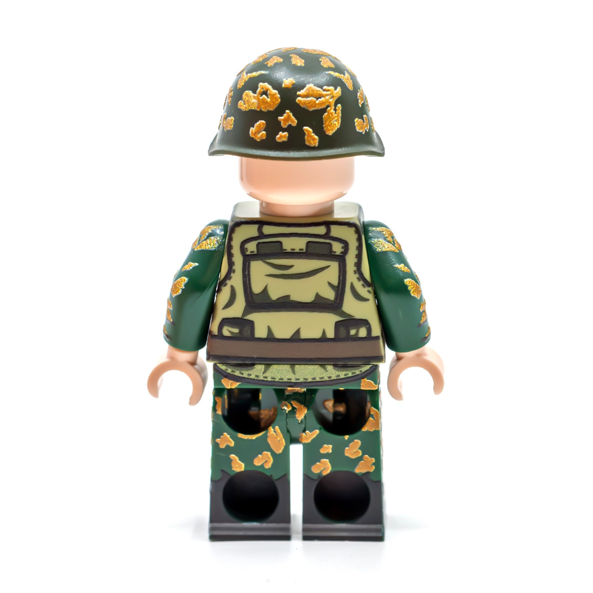 This figure depicts a Soviet assault infantryman of the late-Cold War period. These soldiers in the USSR's forward-deployed divisions were considered the highest-level threat by the CIA thanks to their modern equipment and high readiness standards. This fig is well equipped with a camouflage suit in the KLMK "Sunray" pattern and a 6B3 titanium plate vest loaded with assault equipment. In addition, he sports a matching camo helmet, a field modification sometimes sewn from spare fabric.