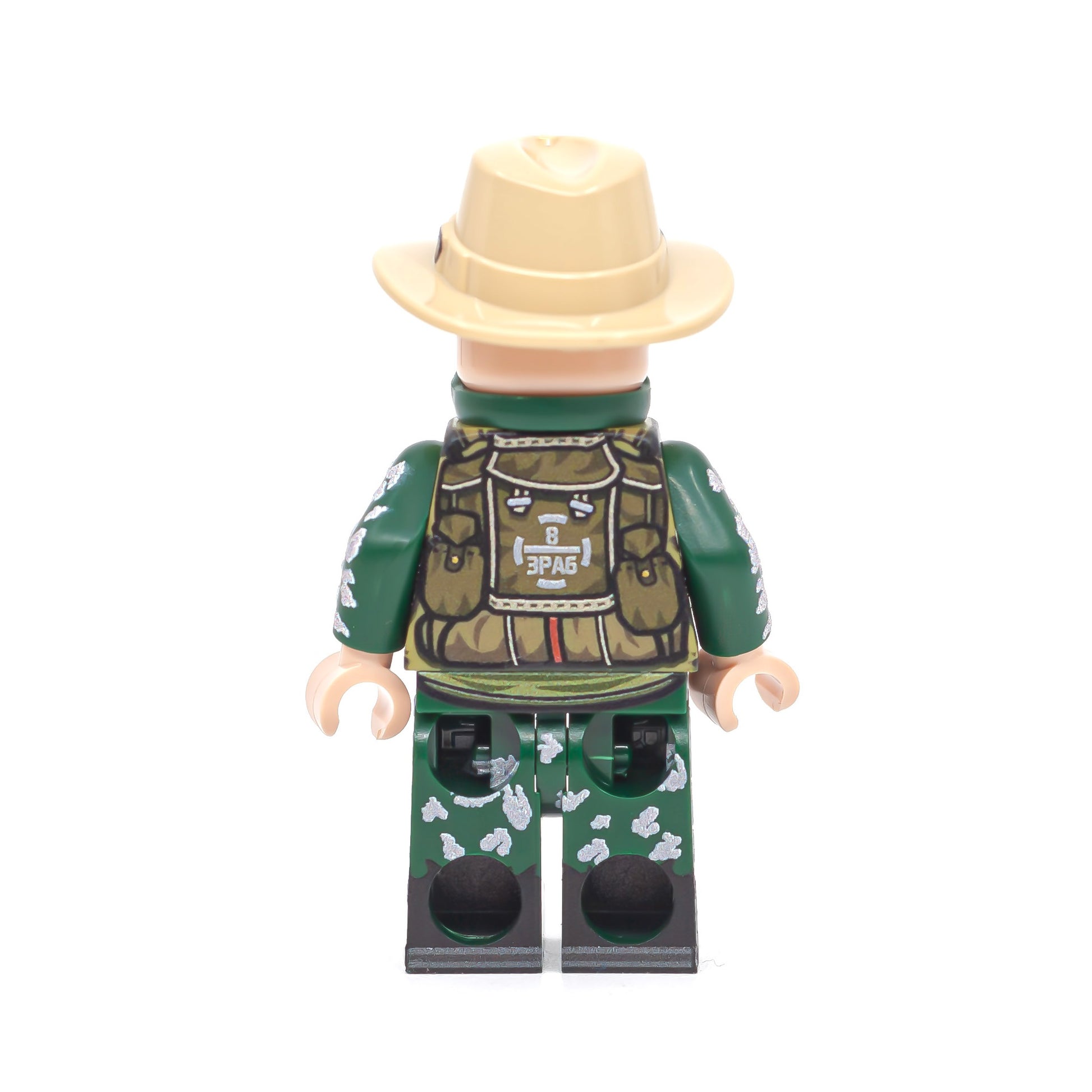As a result of their specialized training and independent tactics, these units were afforded a wide degree of flexibility with their equipment and uniforms. For concealment, the KLMK camouflage suit was a common choice. Above it, this figure sports the Poyas A + Poyas B system, one of the first Soviet tactical vests. On the back, he is equipped with an RD-54 backpack, bedroll, and a few canteens. To keep the sun away, the figure is complete with a Kalinin tropical hat and knockoff aviators, which were prized among Soviet troops.